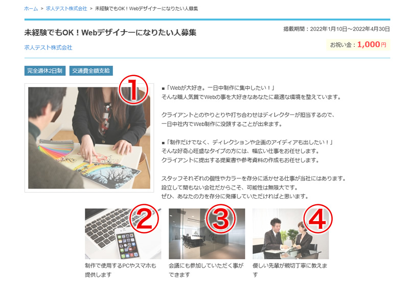 求人詳細ページの【3】に表示される画像になります。画像のサイズは画像設定で設定した、「求人情報のサブ画像サイズ」になり、それ以上の大きさの画像を登録した場合、自動的にリサイズ(縮小)されます。